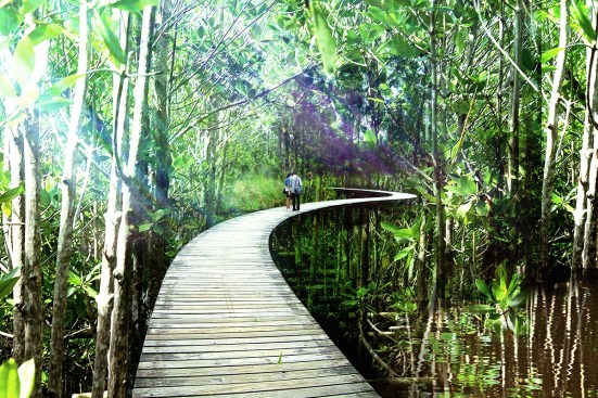 The creation of a woodland nature reserve, together with the replanting of coastal wetland to protect and enhance the mangroves of the lagoon, will also include a network of suspended footpaths to enable residents to access the woodlands, coast and lagoon without disturbing the ground.