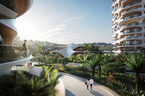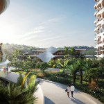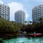 The residential buildings share an elevated platform with integrated perforations, allowing natural light to flood the ground below and enabling tropical vegetation to grow upwards through the platform. Amenities for sport, leisure and wellness are located on this raised platform nine metres above the ground to ensure local wildlife can cross the entire site on the woodland floor without barriers. Being just above the canopy of the surrounding vegetation, residents and guests have views over the treetops to the Caribbean coast and lagoon beyond from all shared amenities.