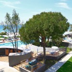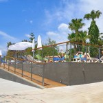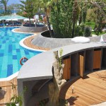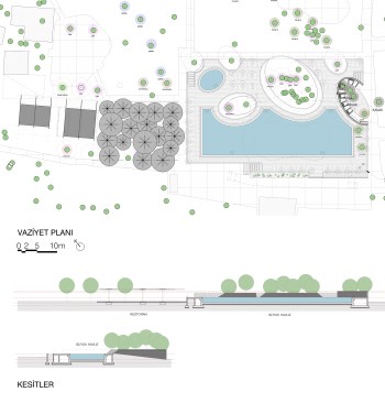 Alantur is one of the long standing beach hotels of Alanya, which is a coastal town that had been projected as “The Turkish Riviera” in the 1960’s. The hotel takes place in between Alanya highway and the Mediterranean sea. The design program of the project consisted of redesigning the existing pool and restaurant area along with its additional services such as toilets, changing cubicles, sunbathing terraces etc. The exceptional green texture surrounding the area, which was formed in years, was the main design input for us while developing the project. Because of the Melen Stream, having the water level above was a critical issue, especially for the rainy seasons. This led to the decision of keeping the pool platform 120cm high above the ground. The distance between the spaces were tended to be alleviated by various ramps and sets combined to the landscape. The grade difference within the area gave us the opportunity to place the service units of the pool (showers, changing cubicles) along the platform setup. A metal canopy was added to the open air restaurant on the west side of the pool. According to the existing plantation & trees that take place in the area, this steel structure was designed and placed irrationally. The toilets and open + closed playground areas were also positioned according to the existing landscape as well as the master plan. The pool and it’s services were completed by the use of exposed concrete accompanied by solid wood elements. Curvilinear cut outs were made on the platform for sunbathing in order to unite the existing landscape with the pool area while enlarging the platform.