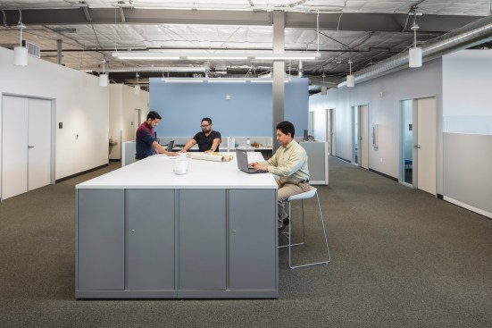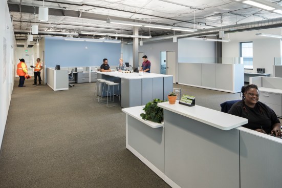 The minimalist exterior—white-painted, flat corrugated metal siding—fits with the aesthetic of adjacent industrial public facilities, while pops of color, including gray and blue accents, as well as bold super graphics on the perforated steel gate, make the building stand out and reconnect to its civic function.