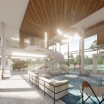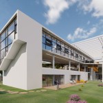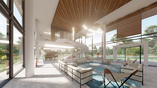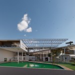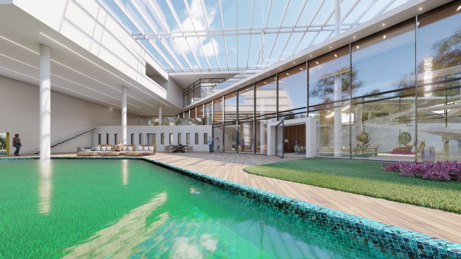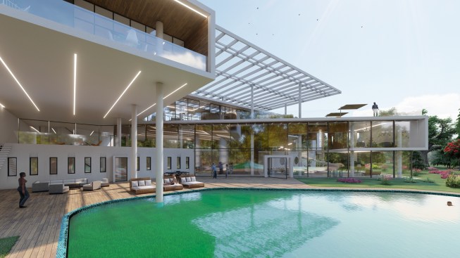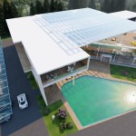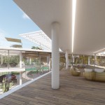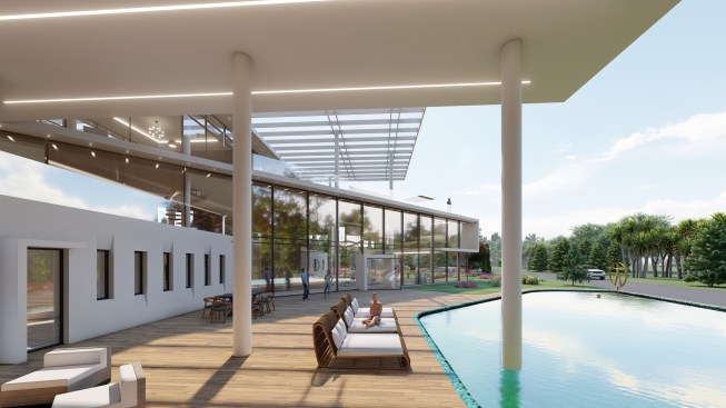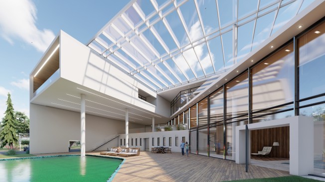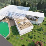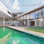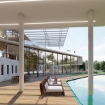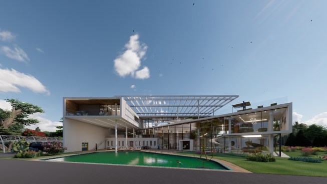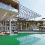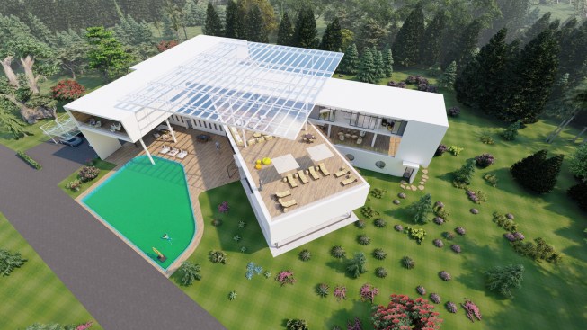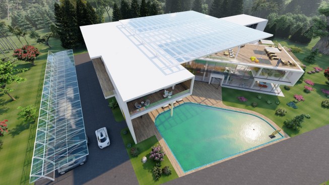The house has 9 rooms, gym saloon, spa, home theater, 2 kitchens, 3 saloons and game saloon. The main saloon is 2 floors high and is located in the mass standing diagonally to the other two masses.