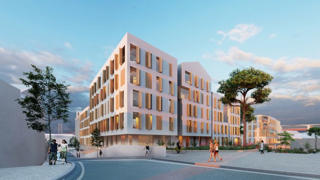 The dialogue between this contrasting urban scheme created a duality which became the contextual foundation for the Alcantara Gardens Project. The massing of the complex is a reaction to this contrast, as in the parts that are facing the existing residential blocks which are remnants of Lisbon's Pombaline period, an architectural style which emerged in the 18th century. They are articulated in a way that reflects the fragmentation in size and offers an interpretation of the local façade style with a predominantly opaque facade and shuttered openings. Meanwhile the elements closer to the waterfront settlement, become bigger in size with a more contemporary façade language in sync with the emerging contemporary building stock along the shore.