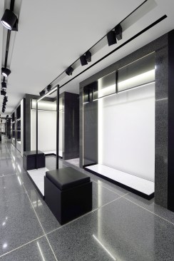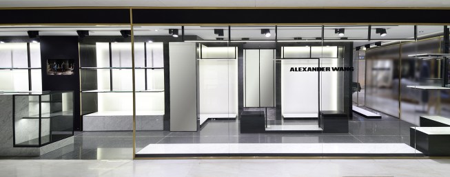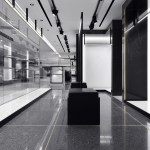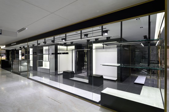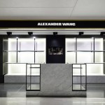 A 720sqft. shop-in-shop in the Sogo shopping center of Hong Kong that utilizes the Alexander Wang concept developed by Christian Lahoude Studio in collaboration with Mr. Wang. The store, which launched in September 2014, implements a floating shelving unit, duratrans displays, minimalist furniture, terrazzo, white Italian Carrera, black Nero Marquina marble, and polished bronze metal. The contrasting black and white is complemented with a balance of transparency and opacity.