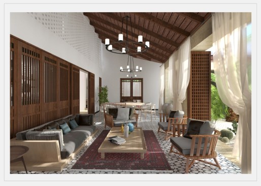 Colours and materials selected for the younger generation, who have a modern taste with a little traditional touch, are more like white mudbrick walls, black metal structural and decorative details, some indigo blues, petrol greens, and contrasting anthracites and dune yellows with minimal, industrial touch.