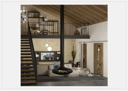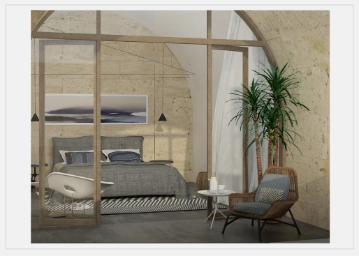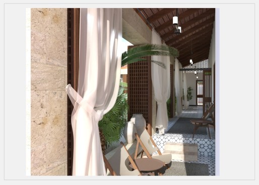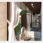 The tilted shape of the building towards the courtyard is a critical passive air conditioning decision, letting the hot air flow out from the created vents through the villa along the roof. Designed and furnished as a modern oasis, the portico surrounding the courtyard is an alternative living area, valuable in this region. The wooden blinds and the curtains, preventing the sandstorms which is already weakened by the plantation, can set apart the portico from the courtyard when needed. Another passive air conditioning method belonging to this geography is the traditional wind catcher (badgir) and is placed in this portico tearing the roof out and stretching towards the sky. These wind catchers are commonly used in the Middle East; in Iran, the United Arab Emirates, Iraq, and Pakistan, to create air circulation within the space and are also seen in ancient dwellings like Yazd, which is an inspiration for this project as well. The chimney absorbs the wind into the space, creating air circulation and rapidly letting the hot air out. Beyond aesthetical concerns, the pool in the courtyard is also designed as a passive air conditioning decision. With the thick plantation around the pool, different trees from the local flora, enriched by plants in pots, the landscape in the courtyard keeps the heat and the sandstorm out while creating a local oasis.