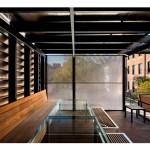 Not only is the rusting of the steel panels on the side of the structure facing the alley a nod to the industrial aspect of the alley, but the color matches the copper on the rear addition of the clients’ home, which Bloomberg’s firm had done in 2004.