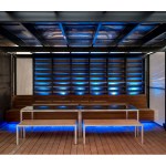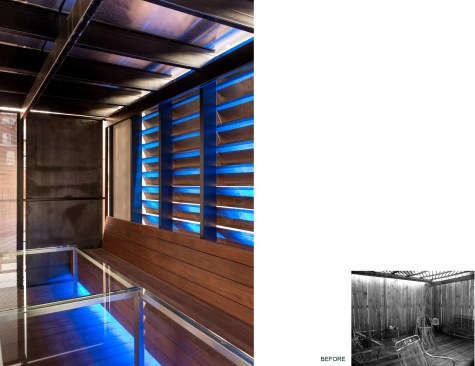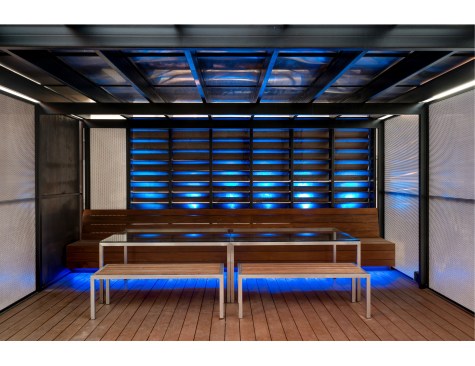 The floor and a built-in bench that runs across the back of the space are made of ipe, as are the slats in the roof where it opens up. The wood adds a warming element to the design, providing a contrast to the metals and helping to bring a lightness to the exterior that Bloomberg felt was necessary. “I didn’t want it to be seen as a heavy box,” she says.