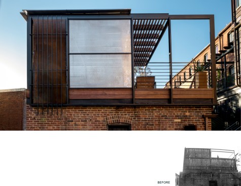 From the architects. This new outdoor deck and enclosure is perched atop an existing rear garage behind a DC row house. The Owners requested a private space for spending time and entertaining, with shade for the intense summer heat. A 6-story apartment building sits behind it across the alley, exposing the the deck to the windows of all the units. Our solution was to create a protective “armor” that shields the deck from outside views, but allows for viewing out from the inside. The roof is solid at the back, keeping the deck cool in summer, but becomes increasingly open as it gets closer to the house. The deck surround is a composition of layered metal, with a steel structural frame, Corten steel panels, perforated aluminum screens, steel railings, and stainless steel paneled roof. The rugged exterior is cohesive with the alley environment, where there is diversity of forms, with mostly functional elements, such as AC units and garage doors. The deck enclosure is similarly straightforward, with each element serving a function – nothing is “decorative.”