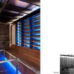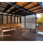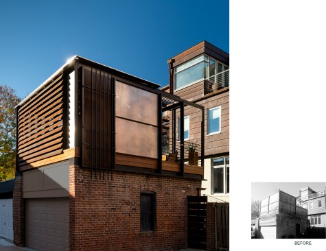 Perforated-aluminum screens and a partially slatted top offer a filter for sunlight and a transition space to the deck’s exposed front, where a steel-railing fence and stairway rails lead down to a lower-level courtyard. The deck also features a new wooden bench built along the back wall. The enclosure’s exterior is a rugged mix of forms, with steel framing, wood accents, and light and dark colors that contrast with the existing red-brick garage below. This mix of colors and styles is designed to work cohesively with the surrounding alley environment, in which both structure and surroundings feature diverse forms and mostly functional elements. — M.S.