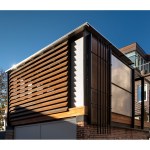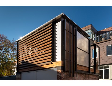 KUBE Architecture’s Alley Armor is both a privacy blind and an aesthetic improvement for a private deck space and courtyard behind a Washington, D.C., row house. The layered-metal structure replaces the former open-top wooden fence around the top of the home’s detached garage, which anyone could look into from the six-story apartment building across the alleyway.