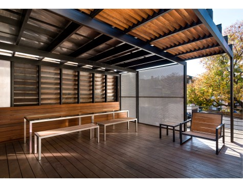 Replacing an existing walled wooden deck that was open to the sky, Bloomberg used pierced metal panels to let in views on the sides of the structure where the roofing was solid. The roof becomes increasingly open as it gets closer to the house, allowing for varying levels of shade and privacy.