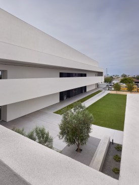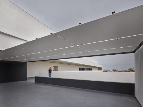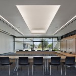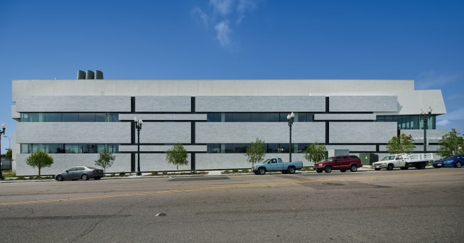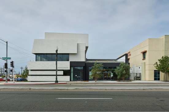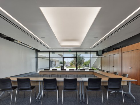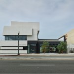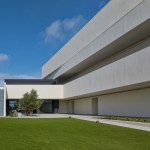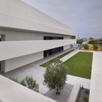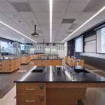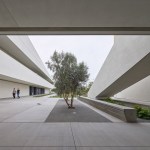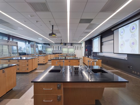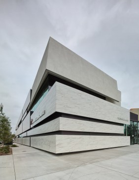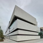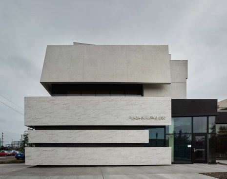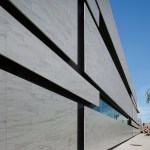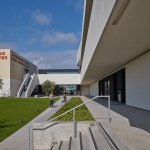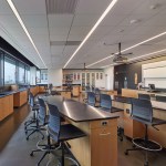The 22,500 square foot facility houses classrooms and labs in support of the college’s health sciences program, as well as community clinic, faculty and administration offices. The main design goal of the project was to “create a microcosm of a college campus.” Classrooms and labs are connected by a covered outdoor passage that faces out onto the quadrangle, which joins the new L-shape building and the existing buildings on the site. The building façade is a wall of marble-print porcelain tile arranged in a large, over-scaled bond pattern, for which the architects drew inspiration from the fortified bases of urban buildings in the prewar American Beaux Arts tradition.