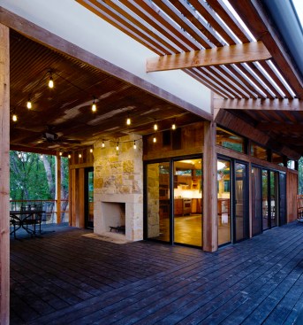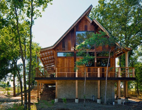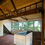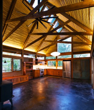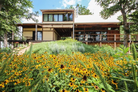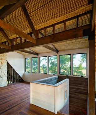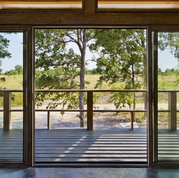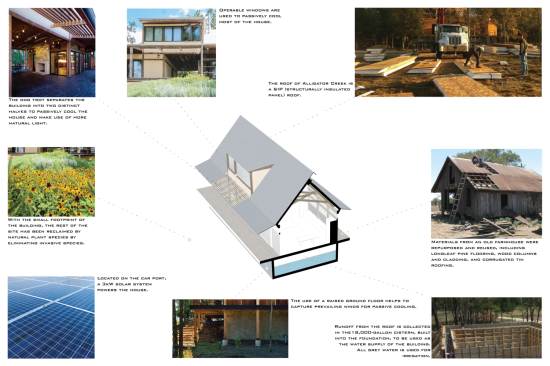 Located on a 60-acre prairie preserve near Taylor, TX, Alligator Creek is a completely off-grid house producing 100% of required power through solar panels and collecting rainwater for all potable water needs. With the building footprint minimized, the remaining site is being reclaimed as natural habitat by eliminating invasive species. Drawing inspiration from Texas vernacular construction and Japanese architecture, the design is reminiscent of a farmhouse with Japanese-style bays. This project contains an 18,000-gallon cistern integrated into the foundation, on-site wastewater management, and SIP (Structural Insulated Panel) roofing. The house is naturally ventilated with operable windows that capture prevailing winds for passive cooling and utilizes wood burning stoves for heating.