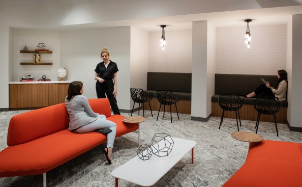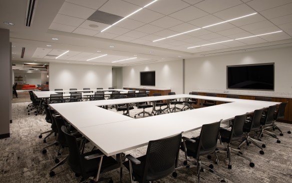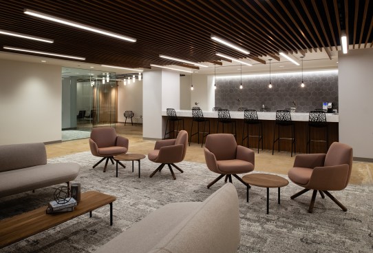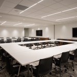 After a site reconfiguration eliminated natural daylight on the concourse level of the primary building on a commercial campus, management turned to Architecture, Inc. for a creative solution to utilize the unoccupied space. The area that was formerly an office suite was transformed into a building-wide amenity through the creation of conference center and tenant lounge. Upon entering the 4,320 sf ALT-SPACE suite, a sculptural felt acoustical ceiling carries through to the main space, past a reconfigurable set of conference rooms. A retractable room divider can separate the large space into two conference rooms, each with dedicated state-of-the-art technology and flexible furnishings.