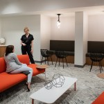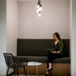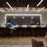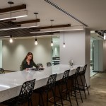 The remaining lounge is a single large space with multiple uses. Floor and ceiling treatments help to define areas while not creating a physical barrier, visually expanding the space. The centerpiece is a wood-slatted ceiling installation with integrated lighting that centers on a large pantry and counter seating area opposite a large flat screen television. Metal screens help to further define an area dedicated to games and group activities. A variety of seating options allow for group meetings, conversation, or individual work. The neutral palette of contemporary finishes helps to further define areas with color and texture.