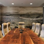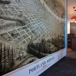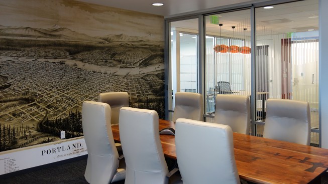 The concept of the repurposed storefront became emblematic for the entire project as we sought to find additional ways to do more with less. The need for daylight, views and acoustic privacy was easily solved, but the need for a level of visual privacy required another design element. Drawing inspiration from the Oregon Cascade Range, OFFICE 52 created custom graphics of iconic mountain peaks and recognizable landscapes using a frosted linear pattern applied as film to the interior glazing. The abstracted graphics are purposefully modulated to provide the appropriate level of visual privacy while reinforcing the firm’s connection to place and creating an intriguing visual amenity. In the conference room, a floor to ceiling reproduction of an 1879 map-plan of Portland looking east to the Cascade Mountains adorns one wall connecting to the city’s historical development and geographic identity.