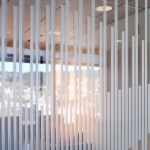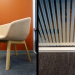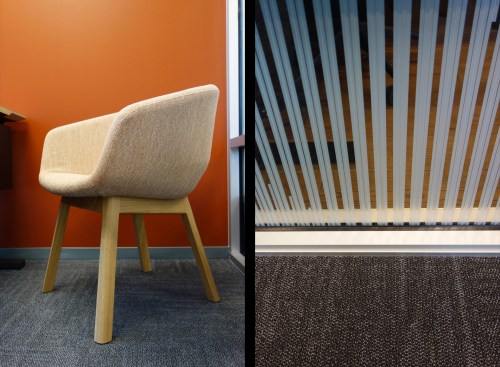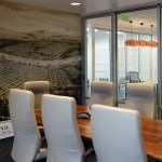 A highly collaborative partnership between OFFICE 52, the client, R&H Construction, and the building owner allowed the project meet the client’s aggressive schedule goals and achieve even greater economy and performance. Interior features include sustainable handcrafted wallcoverings, no VOC paint, PVC-free furniture, high recycled content carpet tiles, high-efficiency LED lighting, and a warm color palette with a crimson red accent. OFFICE 52 worked closely with the client on the spatial layout, colors and furniture selections, and custom designed the conference table and reception desk.