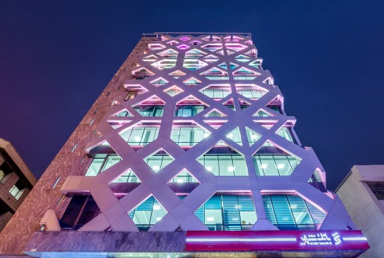 What makes this 12 story office tower iconic, is its double skin exterior. The inner skin is mostly glass. The outer skin is a shading device made of composite aluminum panels fabricated with the aid of laser cutting and bending technology over a steel structure. The pattern chosen for this outer façade is inspired by cosmic symbol and motif of a mandala. This symbol is derived from the Persian belief that intersection between circle and a square is the geometric manifestation of paradise. This geometry is abstracted, repeated and folded on two sides of the outer facade. The outer skin acts as a brise-soleil, shielding the interiors from direct sun providing a healthy and sustainable working environment.