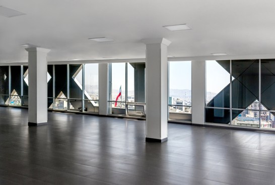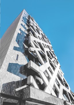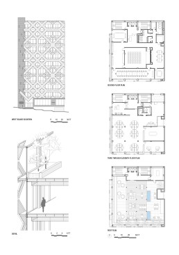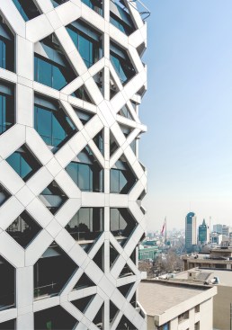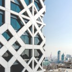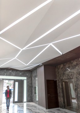 The circulation core occupies the north side of the building and is faced with stone tiles with small openings marking the entrance to the building. At the ground level there is retail space and an entrance lobby with ceiling articulation inspired by Persian squinches continuing the concept into the inside.