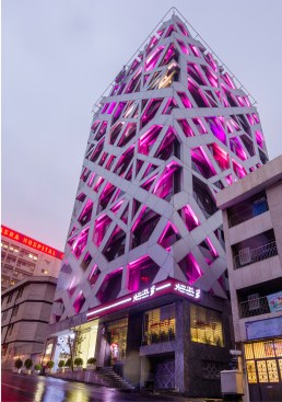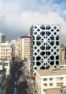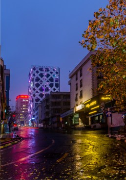 This office tower is located in the dense urban fabric in the center of Tehran. A simple rectilinear plan covers the whole site in a mid block with existing structures on two sides and an alleyway access to a building in the back.