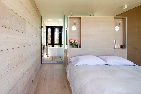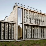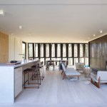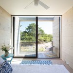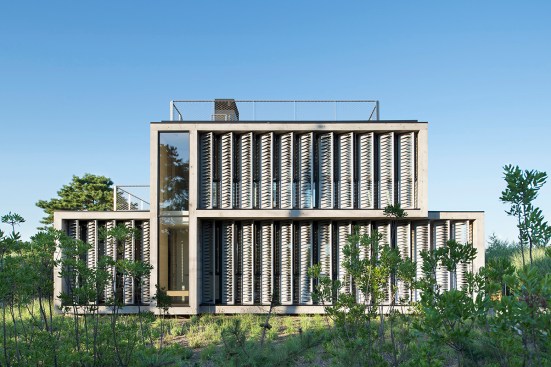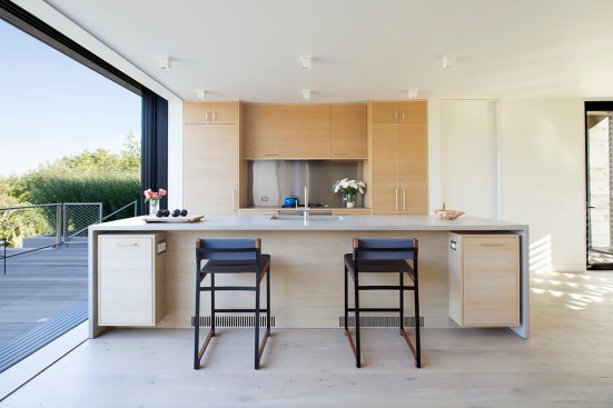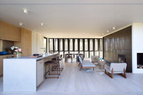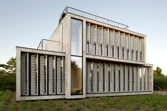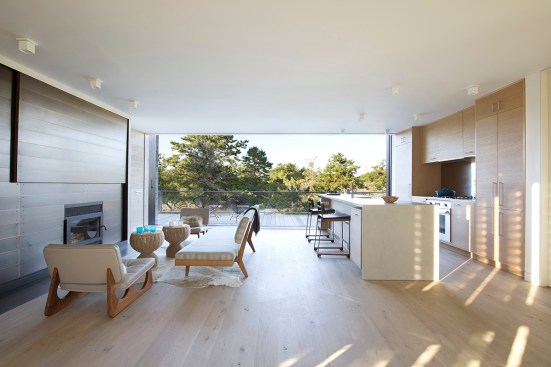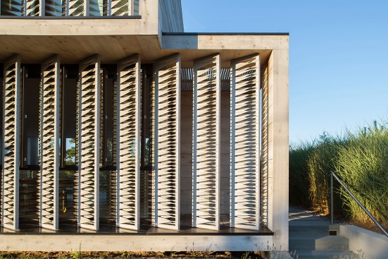 The house is oriented to face the street, the afternoon sun, and the prevailing wind. The entire west and east facades are comprised of operable glass, with small adjustable openings on the windward west side and expansive openings on the leeward east side. The difference in opening sizes creates a pressure differential across the house that promotes natural ventilation. The large doors on the east side open onto decks overlooking the parabolic dunes. On the west side, canvas louvers are oriented toward the southwest to admit the summer breezes that emanate from that direction, while blocking the winter winds from the northwest. The orientation of the louvers also admits the winter afternoon sun while blocking the harsh summer afternoon glare. As a tertiary benefit, the louvers provide privacy from the street.