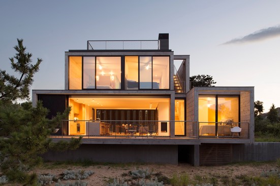 In a town famous for sprawling estates, the clients requested a house just large enough to accommodate their family, in a unique 1950’s development of modest cottages set among rolling dunes, a few hundred feet from the ocean. Local lore says that the dramatic landscape was once used as a film location for desert scenes in silent movies. The clients’ small lot backs up to a preserve, where the forms of windswept trees and dunes record the intensity and direction of the constant coastal wind. The wind scours the sand from around the scruffy vegetation, dragging it into crescent shaped parabolic dunes that point in the direction of the prevailing westerly wind. In the same way that the landscape is formed by the microclimate, so too is the house.