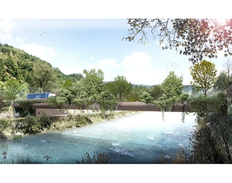 To be Natural – regarding the surrounding environment, with the introduction of a tree planted logistics and pedestrian bridge that makes a connection of the local flora and fauna across the Brembo river. Where as the existing perimeter boundary industrial style fence is replaced with one made from fragments of local natural stone.