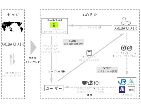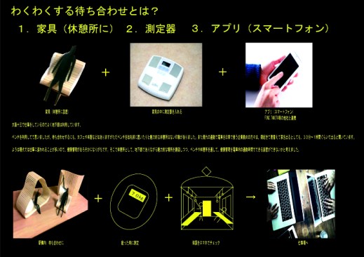 Therefore, while creating an attractive place to take a break, we thought that it would be possible to create a waiting area where people can manage their health during their commute on the train by linking a smartphone application with a waiting area equipped with changeable furniture that shows body composition (pulse, weight, body fat, etc.).