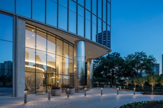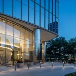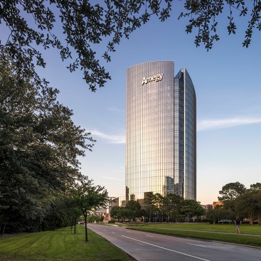 The tower’s gently curved glass façades maximize views of downtown Houston and the Galleria. The tower is accessed through a double-height daylight filled lobby, elegantly detailed in natural surfaces of wood and stone. The high-performance enclosure with 10-foot floor-to-ceiling insulated glass introduces natural light deep within the offices while mitigating solar heat gain. The on-site employee-only dining conservatory offers healthful food options and provides an informal space for spontaneous collegial meetings.