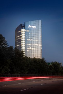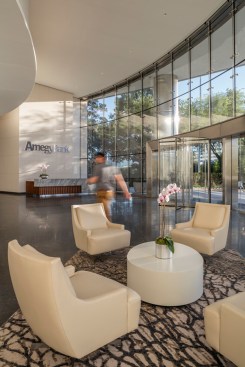 Amegy Bank’s new headquarters is prominently located within Post Oak Park in Houston’s Uptown District. Supporting the company’s long-term fiscal goals, the new corporate office tower accommodates the bank’s current and anticipated growth. The tower features fifteen levels of offices atop an enclosed eight-level parking podium. The podium roof accommodates a 10,000 gsf conference pavilion within a verdant landscaped garden.