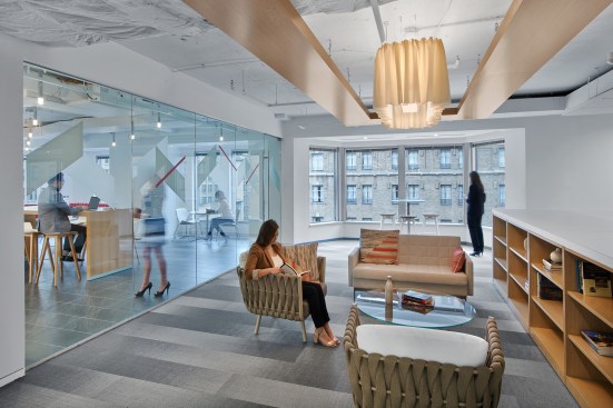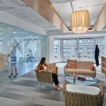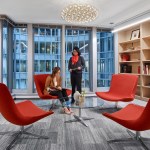CallisonRTKL also strategically emphasized angles and colors throughout the space to delineate workspace types. The finishes and materials lend a sophisticated feel to the entire office and enhance AIA’s existing brand. Angular shapes cut from acoustical felt line the walls of privacy rooms and graphic film patterns on glass emphasize the concept and define collaboration areas. Graphic paint patterns on drywall columns in the open office carry the concept throughout the space.