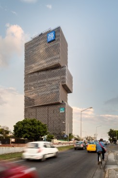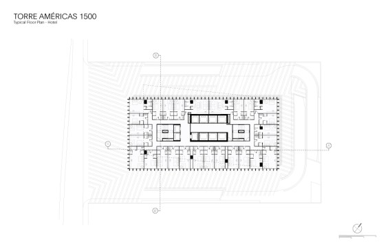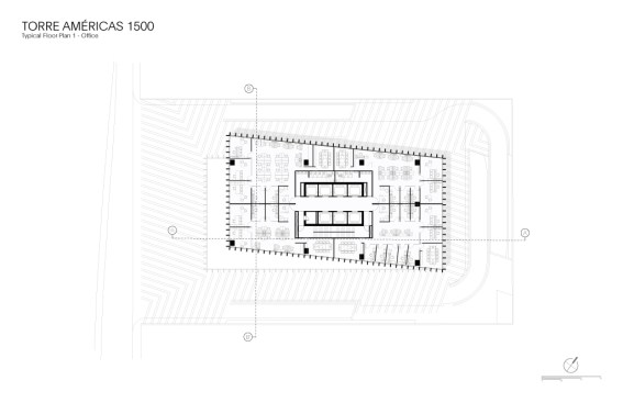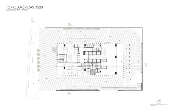Torre Américas 1500 is the first stage of development of a whole complex. This first stage is located on a site measuring 4,116 m², with a built area of 29,461 m² distributed over 26 floors from the ground floor to the last office level, below the heliport. There are 7 basement levels covering a total of 28,509 m². The structural design is based on post-tensioned concrete slabs and a central circulation core.