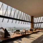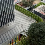 The ground floor is conceived as a plaza, a large public space, providing access and transit for the building’s various uses. A triple elevator core facilitates the operation of the hotel, offices, parking lot, and services. The vehicular and pedestrian entrances are set in a large plaza with textures and vegetation giving pedestrians priority over cars. The dominant textures used in the floor surface are natural limestone, which continues the geometry of the façade across the ground, with randomly-placed areas of paving.