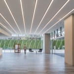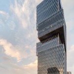 Two of these are slightly offset, and exactly aligned on the rear face. These gestures of displacement are designed to interrupt the robustness of the building and express an elegant sense of movement. The lowest volume houses the hotel, and the three volumes above it are allocated to office use by three different corporations, each occupying one volume in its entirety.
