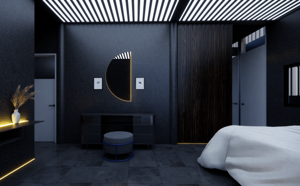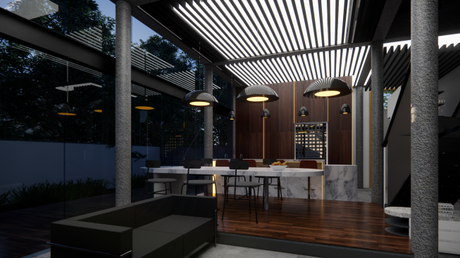 To accommodate relatives staying for extended periods of time and the client’s private practice operations, the ground floor features a self-contained studio and separate office entrance for non-family guests. The rest of the home features five bedrooms, two open living areas, interior gardens, a gym, a study, and a large deck for outdoor events and parties. The building’s façade will consist of two shades of grey flattened Tyrolean (speckled concrete finish) to improve the thermal performance of the interior while creating a minimal aesthetic that amplifies the classical character of the composition.