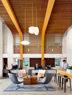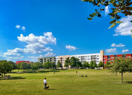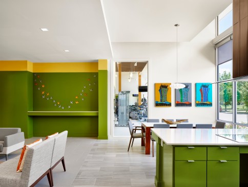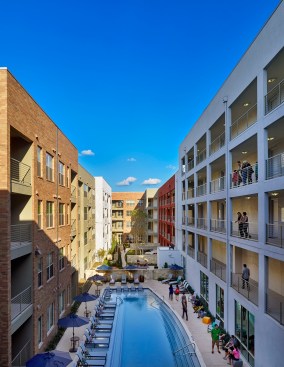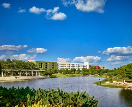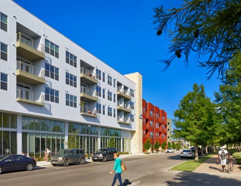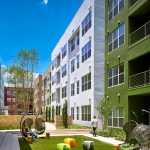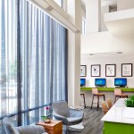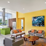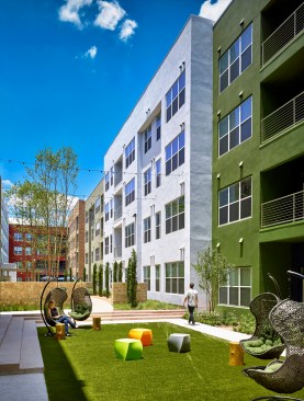 This five-story, 230,000 square foot multifamily AMLI residential project was envisioned as a cornerstone of the 700-acre Mueller mixed-use development– a live/work/play development in east-central Austin. Situated along the shores of picturesque Lake Park, which features over 13 miles of hike and bike trails, the complex was designed as both a bold backdrop for the park and a portal to the central commercial district within the development. As such, the building is composed of a series of brightly colored volumes that vary in height and depth, lending a sense of scale and vibrancy to the park perimeter that is visible from a nearby thoroughfare. The residences are laid out to conceal a five-story, 469 car garage and form two large courtyards that provide both privacy and amenity spaces. One of the courtyards is bisected by a ‘paseo’ that provides neighborhood access to both sides of the complex. The ground level of the project is home to 7,000 square feet dedicated to restaurants and retail as well as AMLI’s leasing offices and amenity spaces. The building design has been extremely well received by the neighborhood whose residents enjoy seeing its colorful forms. The occupants of AMLI Mueller themselves appreciate the project siting and orientation which provides views of Lake Park and downtown Austin beyond from their units. In keeping with AMLI’s sustainability goals, the Mueller project was designed for LEED Silver certification and an AEGB star rating. Units were constructed with energy-efficient plumbing, appliances, electrical fixtures, HVAC and individual programmable thermostats. Outdoors, xeriscaping with drought-tolerant planting reduces water usage as do variable speed pool circulation systems and timers on fountains. Energy-efficient exterior lighting is also part of AMLI’s efforts to reduce the impact on the environment. Additionally, the buildings were designed so that units face primarily north and south thereby avoiding the harsh western sun. The incorporation of two internal courtyards helped to create micro-climates adjacent to courtyard units – reducing heating and cooling loads within. The Mueller neighborhood is a public-private-partnership redevelopment of the original Robert Mueller Municipal Airport which was operational from 1936 to 1999. To create a sense of place within the fabric of Mueller, both the interior and public spaces of the project celebrate movement of all kinds. The interior public spaces, which include the leasing office and amenity spaces, were inspired by the original shapely airplane hangar adjacent to the property and the remaining simple volumetric structures that now house the Austin Film Society’s studios and production facilities within the development. The result is a long, shed-like space framed by deep beams and linear wood infill. In concert with the exterior, color is used to define volumes within the interior, create scale and reinforce the texture of the existing neighborhood buildings. Also in keeping with the fabric of the community, artwork in the shared spaces informs visitors of the development’s history as an aviation center and illustrates the preferred forms of transportation by this generation of Mueller residents. Bicyclists and pedestrians prevail at Mueller and are represented by original artwork created by the project team, local fabricators and artists. Altogether, AMLI Mueller offers 280 units comprised of studio, one-bedroom and two-bedroom floor plans. They are defined by contemporary designs that feature gourmet kitchens with stainless steel appliances, elegant granite countertops, MasterWood plank flooring, designer lighting, and spacious patios and balconies. The model unit which Page also staged serves an important dual purpose. Its artwork, which relates to that in the public spaces, provides a backdrop for the leasing and management team to tell the story of the development and allow future residents to imagine themselves living there. Residents enjoy outstanding amenities including a resort-style pool, courtyard with cabana, grills and outdoor living rooms, expansive fitness zone planned with a view to the park, cyber zone, conference room, and club room with a java bar. These spaces are also festive social hubs that let residents feel connected to not only Mueller but the best parts of central Austin. With convenient access to I-35, downtown Austin and The University of Texas are within a 2 to 5 mile drive. The pet-friendly community also offers a paw wash, gated parking garage and more.