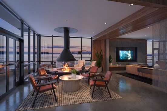 Culminating at the top of the tower, the Sunset Lounge embraces northwest views to the waterfront and sound. The warmth of a flickering fire, mixed with expansive views to water and sky, provide a comfortable, multi-sensory experience.
