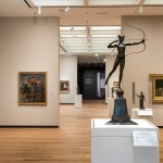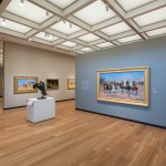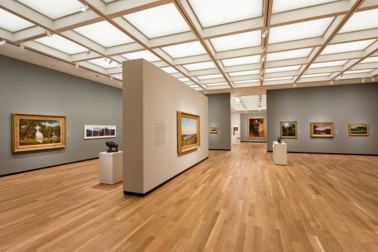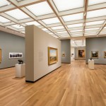 Gallery carpet flooring was removed and replaced with American white oak, and the original dark ceiling is now a soft white. Permanent collections galleries have coffered ceilings that hint at Johnson’s original intention to include skylights. They are composed of fabric and LED laylights designed to evenly illuminate the galleries and enhance their acoustics. The spaces were reconfigured to allow for a continuous exploration through different eras of American art. New mobile, modular gallery walls are highly adaptive, allowing the museum flexibility to expand and contract spaces and accommodate new and changing exhibits.