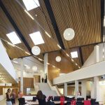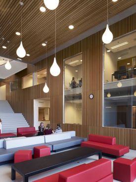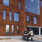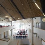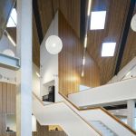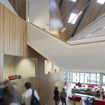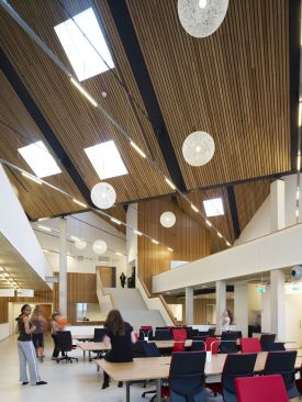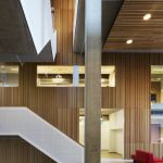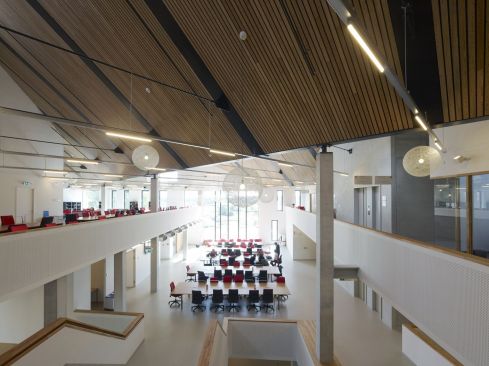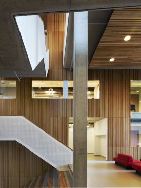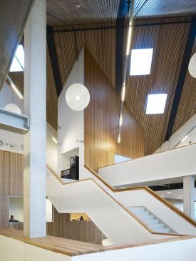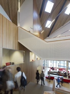 The transparent entrance and striated Cor-Ten steel facade lend the square building a distinctive but friendly appearance. Diagonal roofs running north-south create a vast attic with a striking, folded timber-clad ceiling. Underneath these folds are quiet, hidden study areas and the library.Voids through the centre of the building provide legibility and vistas. Students meet one another on the grand staircase that links the voids and features integrated seating.
