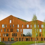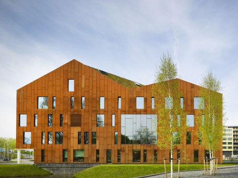 The compact building volume and sedum green roof contribute to the sustainability of the AUC building, which has a Greencalc+ rating of 200.