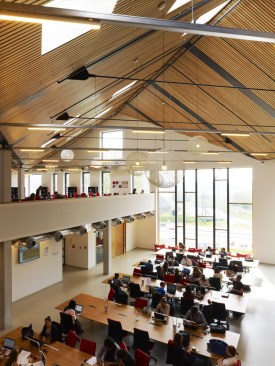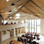 Spaces such as the restaurant on the ground floor, the common room and the study room have double-height glazing for generous views over the Science Park. The interior finishes such as the grey poured floor and concrete walls in combination with the timber ceiling with skylights create a rich space with a warm atmosphere and beautiful sense of light.