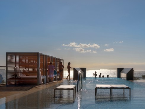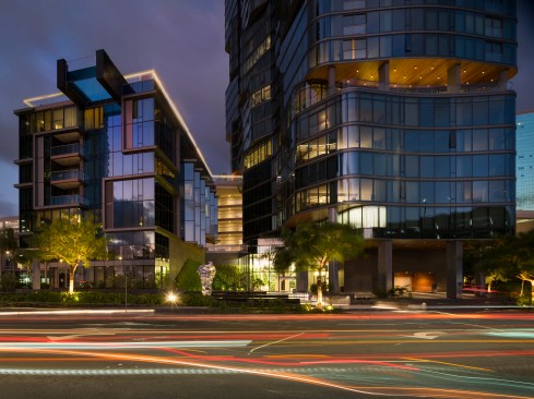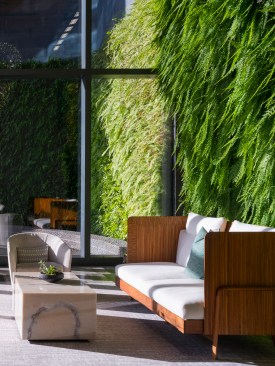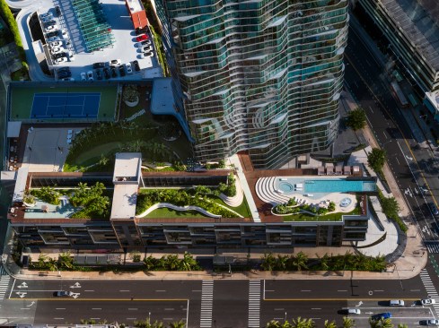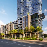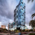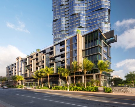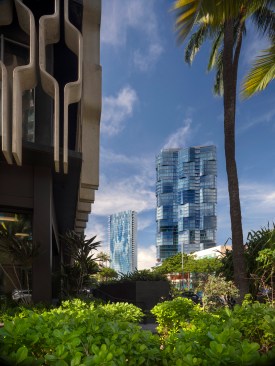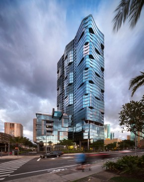 Combining history, context, and culture, the Anaha tower is an extraordinary example of contemporary architectural place-making. The condominium begins the implementation of Ward Village®, which is largest Platinum Certified LEED for Neighborhood Development (LEED-ND) masterplan in the country. Designed by Solomon Cordwell Buenz (SCB) in partnership with Honolulu-based Benjamin Woo Architects, Anaha is the second residential condominium tower to be completed within the award-winning 60-acre master-planned community transforming Honolulu’s urban core. Located in the vibrant Kaka’ako district of Oahu, the 40-story, 857,000-square-foot tower creates 311 condominium homes that will help transform the previously industrial and retail focused district into a 24-hour mixed use community. Anaha means “reflection of light” in Hawaiian. The tower’s undulating form was inspired by the island’s artistic tradition of abstracting waves. Through a sequence of shifted, interlocking, and softly curved floor plates and its high-performance glass curtain wall, the façade appears to be ever-changing in the light, like a wave shimmering in the sun, making the tower a distinctive and dynamic addition to the coast line. The orientation of the tower’s long axis is placed ‘Mauka-Makai’, or mountain to ocean, which preserves coastal views from inland vantage points. The tower is brought cleanly down to the street to mark the residential entrance. The podium retail and townhomes activate Kamakee Street. Retail spaces, geared toward local artisans, are arranged along a shaded pedestrian promenade that connects Auahi and Queen Streets and feature operable facades to connect directly and stimulate street life. Between the tower and podium geometries, a tranquil water feature is framed by one the country’s largest verdant ‘living walls’, which contains a blend of 8,000 indigenous tropical plants and passes through the lobby façade, connecting outside and in. Perched 80 feet above Auahi Street, a glass-bottomed, saltwater pool cantilevers 15 feet off the edge of the seventh floor amenity deck creating a memorable spectacle. The design for Anaha employs numerous sustainable strategies and materials to create a building that is both environmentally responsive and focused on resident comfort. Since conventional faceted glazing could not convey the design intent and sinuous contours of the facade, the design team turned to large-format, solar-efficient radiused glass to meet both the technical performance and desired aesthetic. Juliet balconies allow the façade to open up, taking advantage of warm ocean breezes and allowing for an indoor/outdoor living experience for residents. Locally sourced materials also contain recycled content to the greatest degree possible and were selected to reduce or eliminate volatile organic compounds (VOCs). Kitchen appliances and plumbing fixtures and fittings are energy- and water-conserving models.