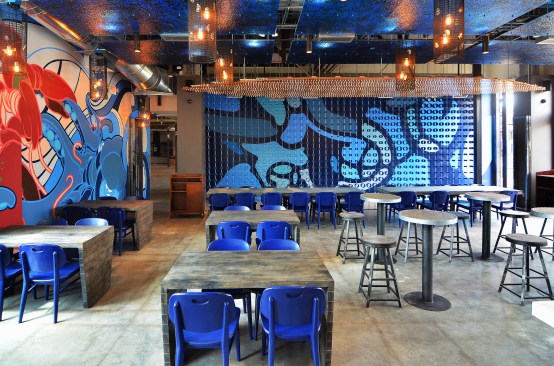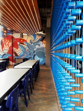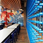 Anchor Hitch’s breath-taking design brings to life the idea of being underwater in an oyster farm. This 2,700 SF restaurant features custom industrial furniture with a classic marble bar looking out into the “oyster room.” The key feature of this spatial design is the para-metrically-designed “pipe wall” consisting of 880 unique steel pipes that create an energetic partition between the restaurant and the rest of the popular Union Market, where it is located.