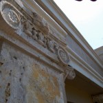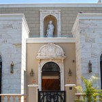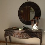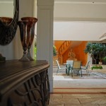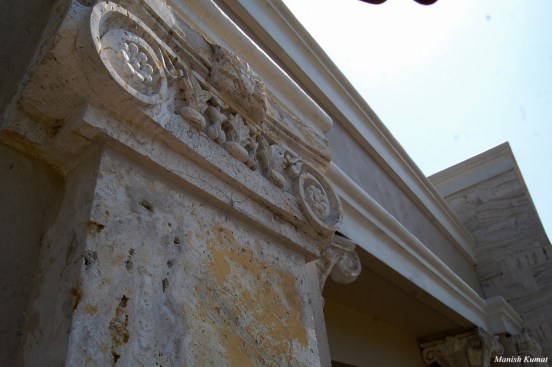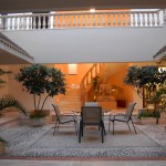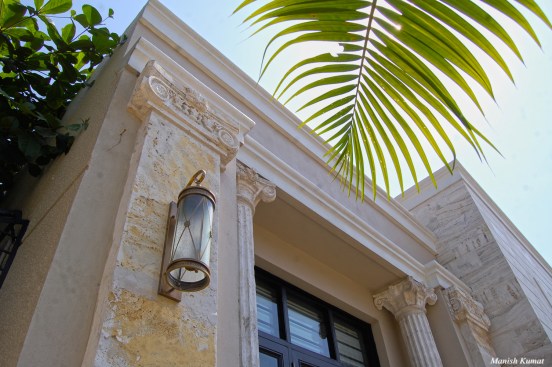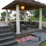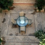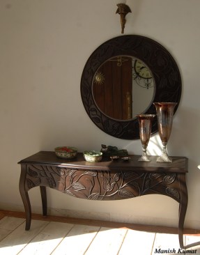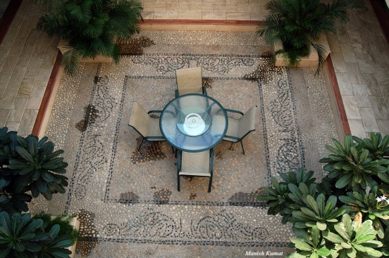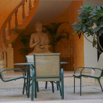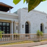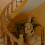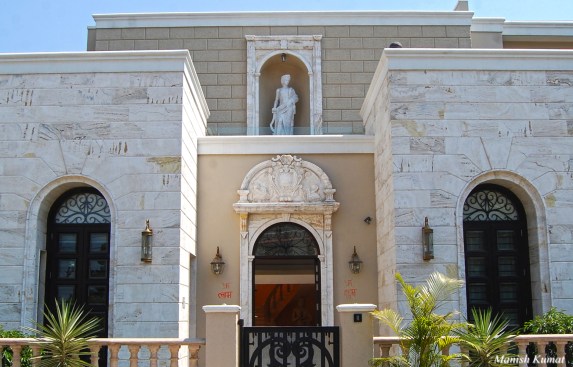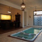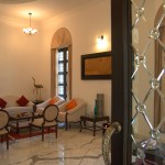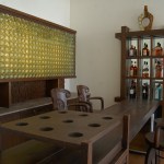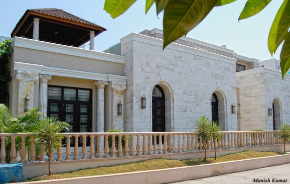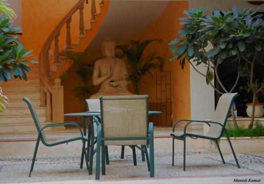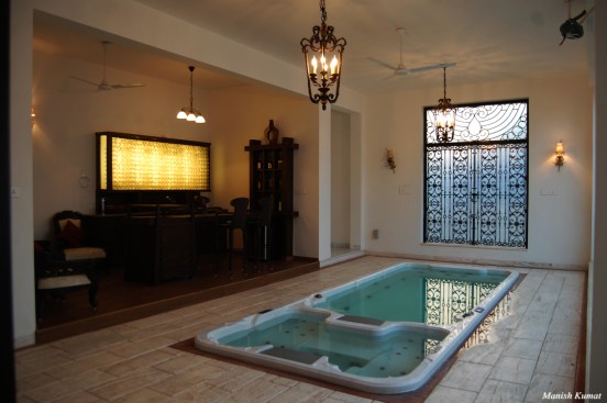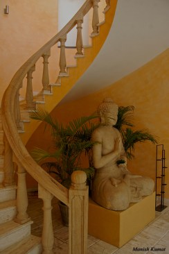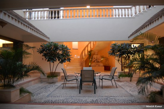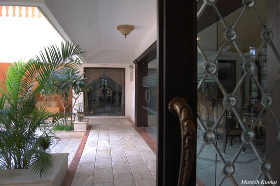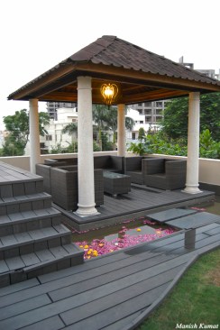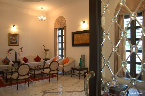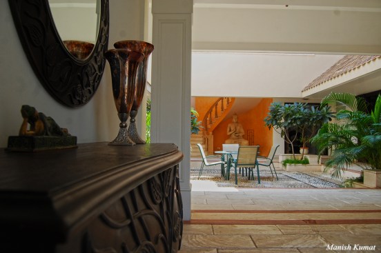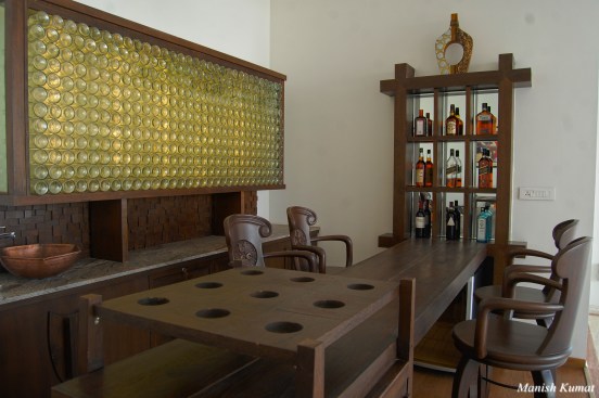 As we enter inside, a big courtyard with lots of greenery and sunlight is inviting. A huge Buddha in sitting meditation position with greenery near to court makes the whole environment peaceful and static. The plan revolves around a central courtyard open to sky. The inhabitants experience all the weathers, throughout the year. The planning theme involves, putting up all the four important bedrooms on the ground floor. This private area of the bedrooms along with the living hall is segregated by the public area drawing room, kitchen and Puja room by landscaped courtyard. A huge volume of drawing room with tall windows and the handmade canvas painting on ceiling gives the royal look. The living room is planned outside all these four rooms with a toughened glass partition up to the ceiling to view the beautiful courtyard outside with green and the huge Buddha statue. Mezzanine floor created for playing zone in younger son’s bedroom. A round staircase smoothly connects two floors, with stucco finish walls and well lit POP niches. First floor has a bar, a covered swimming pool, a recreational area which includes steam, sauna, etc. As we move towards left side on the first floor, we get surprised by a beautiful view of a huge lawn with gazebo.Intelligent usage of materials as waste glass bottles, scrap walnut pieces and mother of pearl inlay. The regular materials used are bricks, solid/teak wood, and toughened glass along with travertino stone.