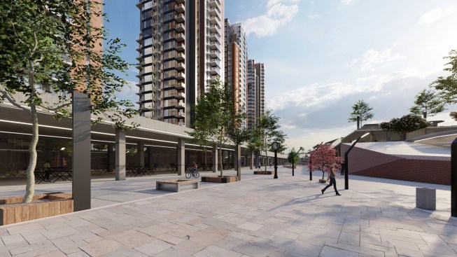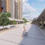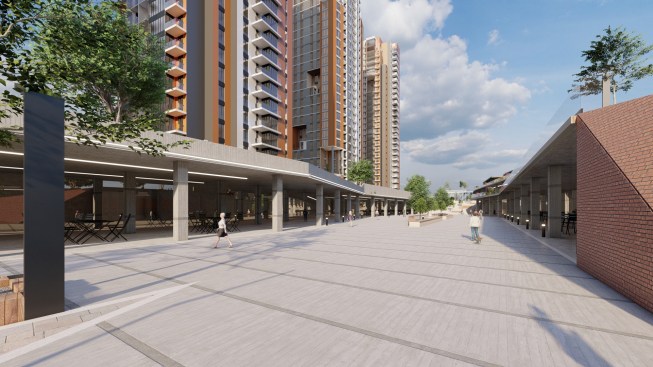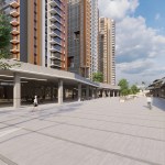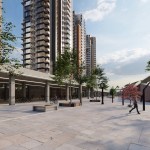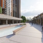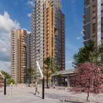 It has commercial areas, shopping malls under the blocks and around the courtyard. Commercial areas takes the main facade of the main street in front of the housing blocks.