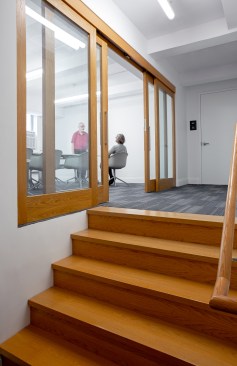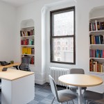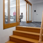 By relocating the previously windowless offices to the fifth floor, Studio ST tripled the area of the lobby, creating a new, light and welcoming double-height space. The addition of wood bleacher-style seating, a large coat room, stroller parking area, and two all-gender ADA bathrooms accommodates the guests participating in the many programs and services that take place in the building throughout the day. The new office suite on the fifth floor provides a bright work environment with windows overlooking the Hudson River. By redesigning the basement level, Studio ST transformed the social hall (Hirsch Hall) and its annex, which is used during the weekdays as a gymnastics gym, into a simple yet beautiful space that can also accommodate Bar Mitzvahs, High Holiday services, and communal events.