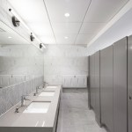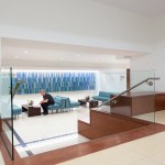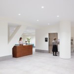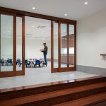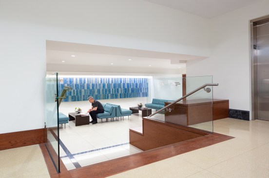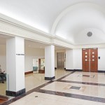 The original terrazzo floor in the main lobby was restored, and a similar terrazzo tile complements it in the new lower lobby. Locating the security office and bullet resistant doors at the main entry provides added safety to the building. The steel security doors at the main entry have bullet resistant glazed openings and are clad in rich wood, simultaneously acting as a safety measure and a seamless design element that is respectful to the synagogue’s historical characteristics. With these design choices, the renovation sought to provide much-needed upgrades to accommodate contemporary needs while respecting the synagogue’s past.
