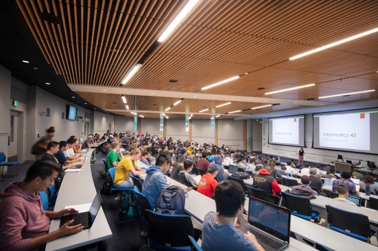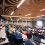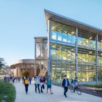 The 65,000-square-foot facility brings active learning and 21st century educational opportunities to students across the campus. Flipping traditional education on its head, the new building supports active learning strategies that maximize collaboration and emphasize exploration, discovery and testing ideas. “It’s all about social performance. The interactive functionality of the active-learning classrooms extends to a sequence of community spaces—interior and exterior—providing students with lots of choices for group work and social connection,” notes George Shaw, FAIA, Partner at LMN Architects and Partner-in-Charge of the project. Set in the heart of the 1,500-acre Irvine campus, the design promotes a diversity of team-based modes of learning and social interaction, while extending the active learning experience to the surrounding Aldrich Park campus neighborhood. The project is composed of three primary elements: a two-story elliptically-shaped Pavilion housing lecture halls; a three-story classroom wing framed by a student Mixing Hall; and the Bridge, a central, vertical circulation and gathering space that interconnects the functions of the two primary structures. “By assembling program areas into distinct building components and then pulling those components apart, we were able to break down the scale of the buildings and create opportunities for social interaction in those interstitial spaces,” notes John Chau, AIA, Partner and Project Designer at LMN Architects. The new complex features two floors of day-lit classrooms and circulation areas (the Mixing Hall) and a third level, which houses student offices and computer labs. Natural light filters through the exterior sunshade latticework to the mixing zone’s circulation and collaboration spaces. Accessed from large campus plazas on two sides, a series of community spaces capture expansive views to Aldrich Park and the broader campus landscape, creating an interconnected indoor-outdoor student experience. The elliptically shaped Pavilion anchors the entry plazas, while housing two multi-use lecture halls—one 400-seat and one 250-seat. The halls employ a double-tier seating configuration that allow students to work in sub-groups, while preserving lecture and case-study functionality. An exterior loggia adjoins the Pavilion to the pedestrian scale of the plaza, with perimeter seating clusters and an open-air stairway that spirals to the upper level walkway. Vertical window openings bring light to the instructional spaces while creating an internal glow that animates the Pavilion’s evening presence within the plaza. “LMN’s creative approach of unlocking the site and rearranging the program led to a bold design solution that enhances the overall experience for both students and faculty,” said Brian Pratt, AIA, LEED AP, Campus Architect for UC Irvine. Inside, flexible furniture, multiple writing surfaces and wireless projection all serve to optimize active learning, which places an emphasis on problem solving and interactivity with instructors and fellow students. In fifteen smart classrooms and auditoriums, old-school audiovisual equipment has been replaced by sleek computer screens on every wall and desk. Each can be linked to from laptop or mobile devices. Seats swivel for group exercises. A high-performance building envelope reduces the need for extensive mechanical and ventilation systems, which in turn lowers operating costs. Natural daylight floods virtually every space, minimizing the need for supplemental lighting. A rooftop solar array further reduces greenhouse gas emissions by a respectable 47.4 metric tons per year. Site storm water is handled by an onsite biofiltration system. The complex is designed to meet or exceed the CALGreen 2013 Building Code and LEED Platinum certification (New Construction V2009) is anticipated.