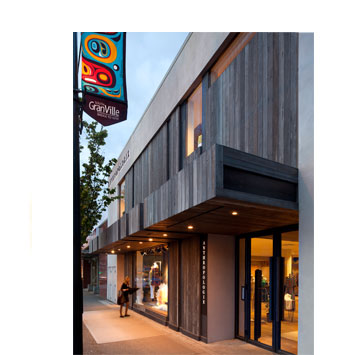 Vancouver, British Columbia – MulvannyG2 worked in collaboration with Urban Outfitters, Inc. to create a unique shopping experience catering to Anthropologie’s eclectic female clientele. The exterior of the store, located on Granville Street in the heart of Vancouver’s retail center, utilizes reclaimed cedar which folds inside the store to create engaging interior spaces. Reclaimed materials, including the white oak flooring, are used throughout the interior of this two-story, 10,000 square foot shopping atmosphere, while an existing skylight becomes a focal point for a “feature wall”, creating an aesthetically warm feeling with various finishes. This one-of-a-kind design is of timeless permanence where retail exhibits can be adapted to different merchandising layouts as needed throughout the year, but the overall aesthetic and fascinating retail experience remains the same. This supports Anthropologie’s ever-changing vignettes and enhances the customer experience, enticing them to peruse longer and purchase more.