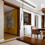 Entering the living room, subtly chequered tiles snake across the periphery of the room. Created with an open layout, the walls of the living room are draped in an earthen colour, with a corner containing a white Kolam pattern which traditionally adorns houses across India during the festivities. However, the most striking object within this space is the Attukattil Jhula, crafted in wood with traditional oonjal supports done in brass. It reinforces the homeliness of the space, and adds a sense of playfulness to the volumes, giving the viewer an opportunity to unwind and feel at home. Wood has also been used carefully across the space across the living room, adding warmth to the space in a harmonious manner.